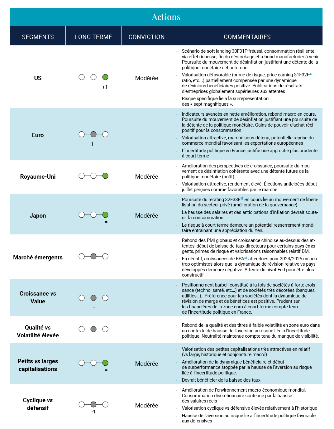 En Europe, le secteur bancaire a très bien performé, notamment les banques françaises et italiennes, du moins jusqu’à l’annonce de la dissolution de l’Assemblée nationale française. Nous étions surexposés sur ce secteur depuis la fin 2023, car il demeure sous-détenu malgré une amélioration de ses bénéfices et de ses multiples. Nous sommes neutres en ce début de deuxième semestre car le secteur financier figure en première ligne face à la résurgence du risque politique en Europe.