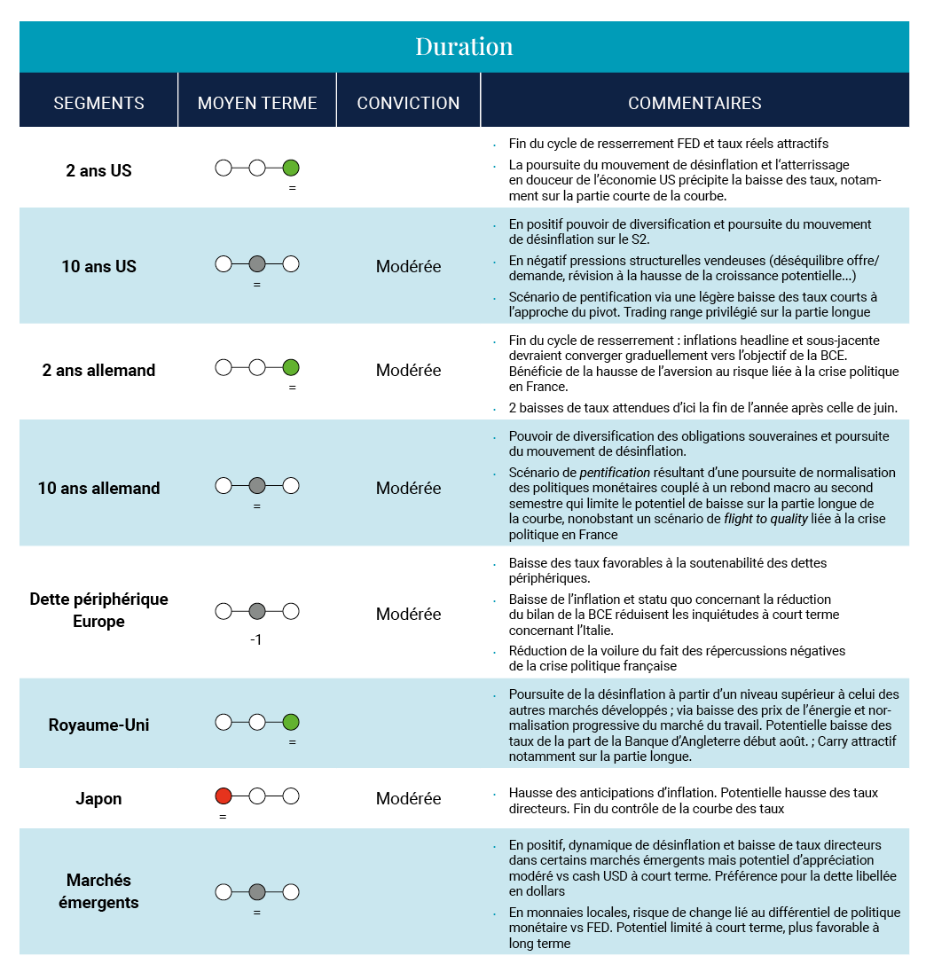 Néanmoins l’agenda politique/géopolitique fait peser un risque baissier sur l’activité au second semestre. La moitié de la population mondiale est cette année appelée aux urnes et chaque élection a pour l’instant engendré des replis boursiers, comme nous avons pu le voir en Inde, en Zone Euro et notamment en France dans le sillage de la dissolution de l’Assemblée nationale. Cette dissolution a ravivé les craintes sur la trajectoire budgétaire que va prendre la France, avec une possible – probable ? – aggravation du déficit.