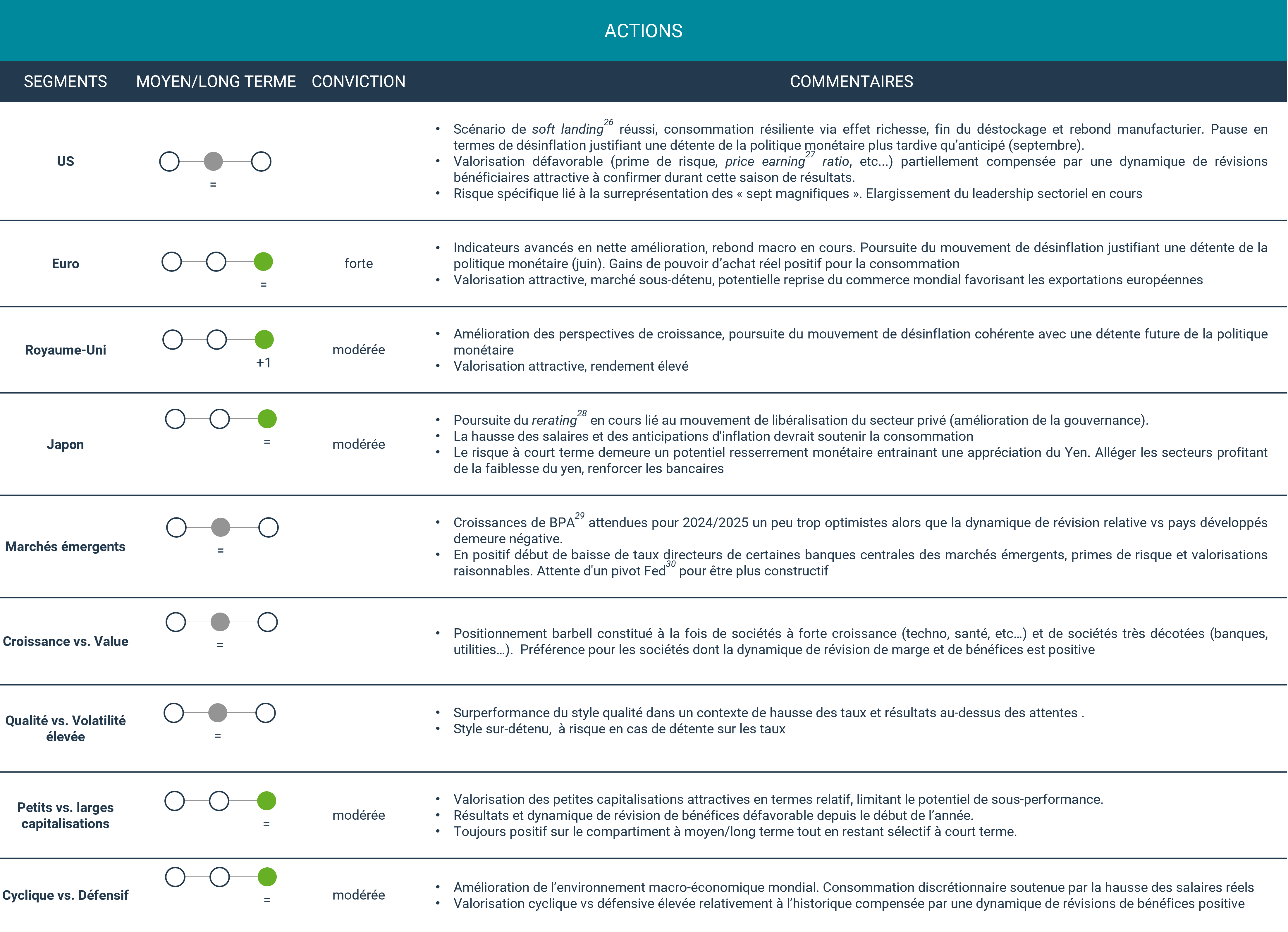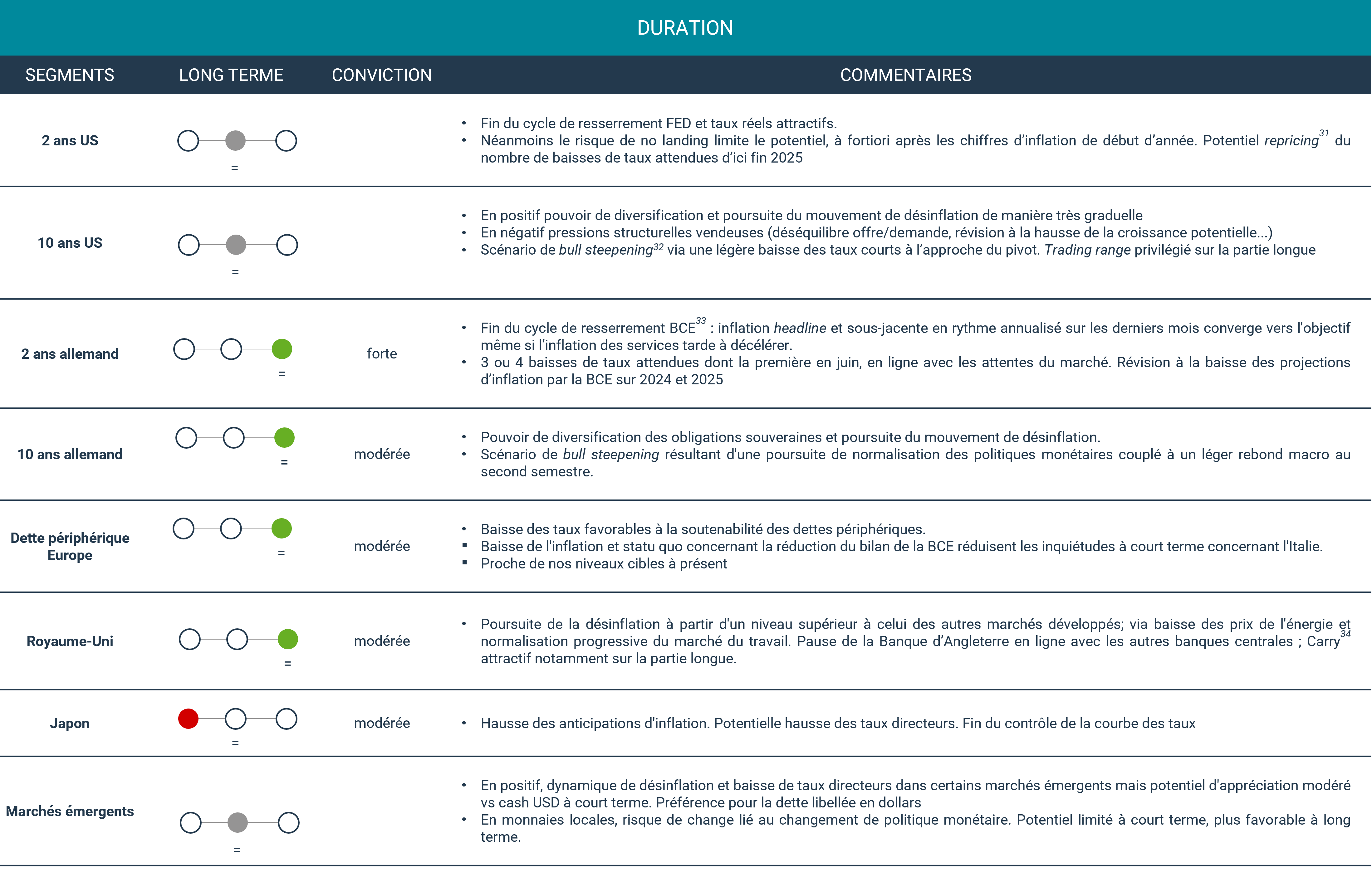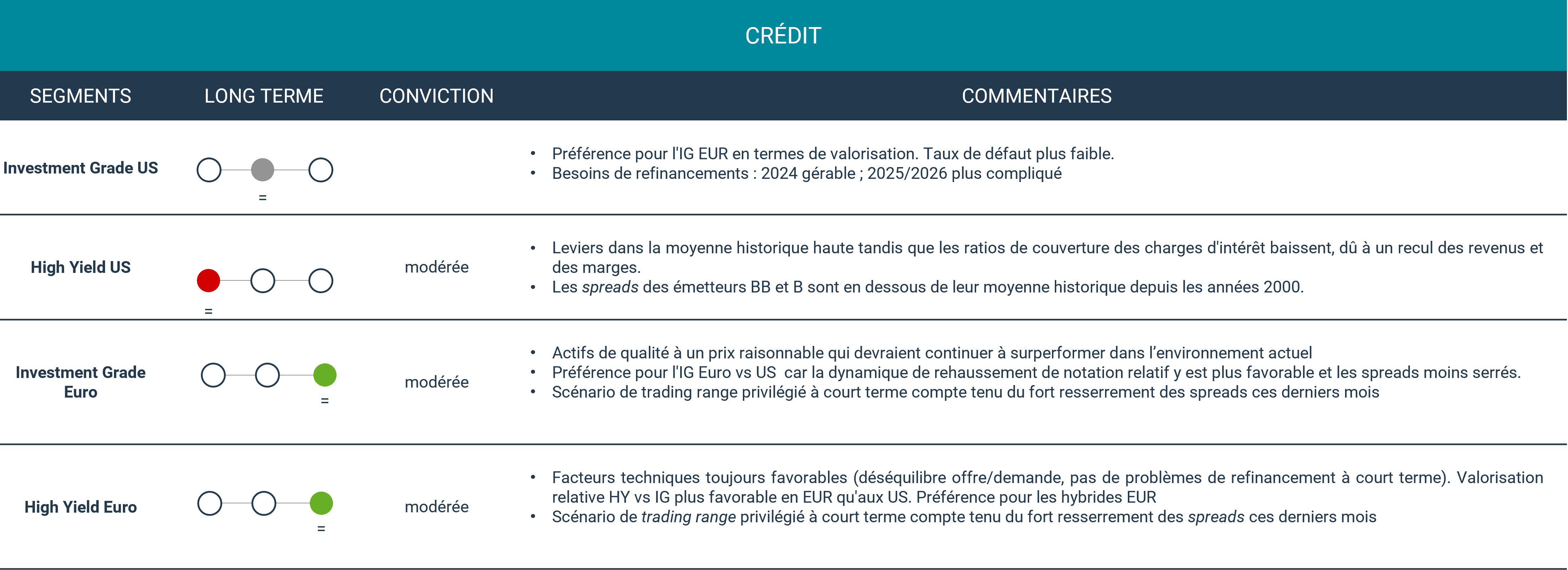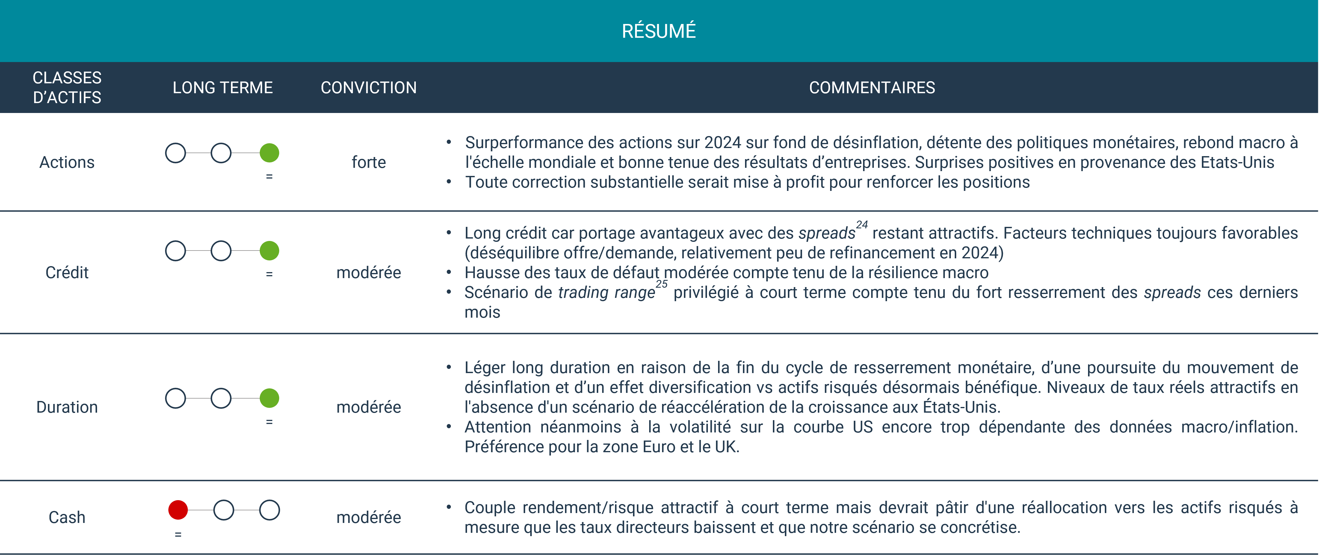 Ceci explique un début d’année encore poussif, mais nous estimons que la situation s’améliore et qu’il devrait y avoir un rebond à partir du deuxième trimestre, qui s’amplifierait sur le troisième. Le PMI17 composite de la zone euro a été révisé à la hausse à 50,3 en mars11, à savoir le niveau le plus élevé en dix mois, soulignant un retour de la croissance pour le secteur privé. Un large éventail d'indicateurs avancés confirme cette tendance et le retournement du cycle des stocks laisse espérer une reprise manufacturière graduelle. Enfin, la désinflation plus marquée en Europe qu'aux États-Unis offre plus de latitude à la Banque centrale européenne par rapport à la Réserve fédérale pour assouplir sa politique monétaire. La BCE devrait se trouver en mesure de réduire ses taux d'ici juin.
