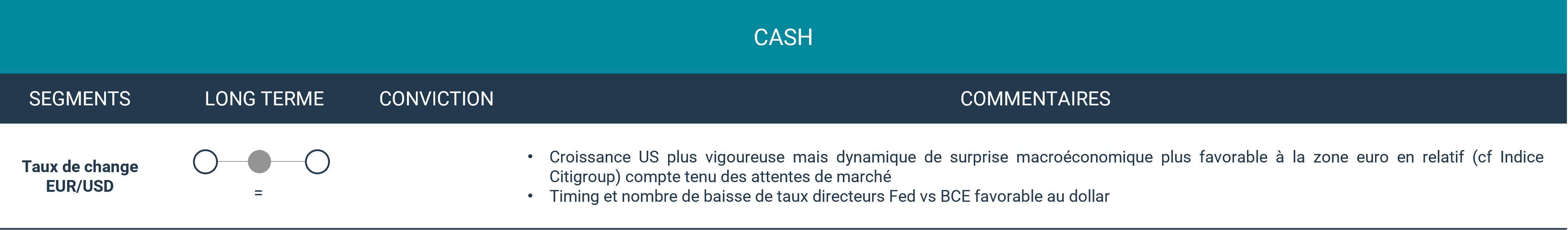 Face à la solidité de l’économie américaine, notamment en termes d’emploi et compte tenu des derniers chiffres d’inflation, la FED prendra ses décisions réunion après réunion, sans précipitation, au gré des indicateurs. Les bonnes conditions de l’économie américaine offrent à la Fed du temps avant d’agir. Jerome Powell a également écarté une des baisses de taux anticipées par le marché pour 2025. Notre scénario central à présent est celui d’une première baisse de taux en septembre, suivie d’une autre en décembre après les élections. L’incertitude demeure quant à la poursuite de ces baisses en 2025. Il faudra, dans le même temps, suivre de près la trajectoire de la dette américaine, qui s’accroit à un rythme très soutenu, et très commenté, mais que la poursuite des gains de productivité permet en théorie d’absorber.