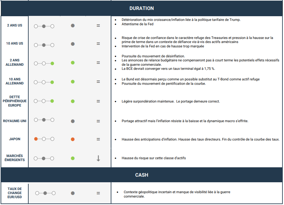 Aussi cette guerre tarifaire devrait renforcer le mouvement de désinflation, y compris en cas de ripostes de l’UE sur certains biens américains. Le ralentissement de la demande extérieure, les surcapacités mondiales, la baisse des prix de l’énergie et des matières premières ou encore l’appréciation de l’euro face au dollar plaident pour une baisse de l’inflation. De quoi apporter à la BCE suffisamment de visibilité pour poursuivre son assouplissement monétaire, avec comme objectif un taux directeur que nous estimons désormais à 1,75 %13.