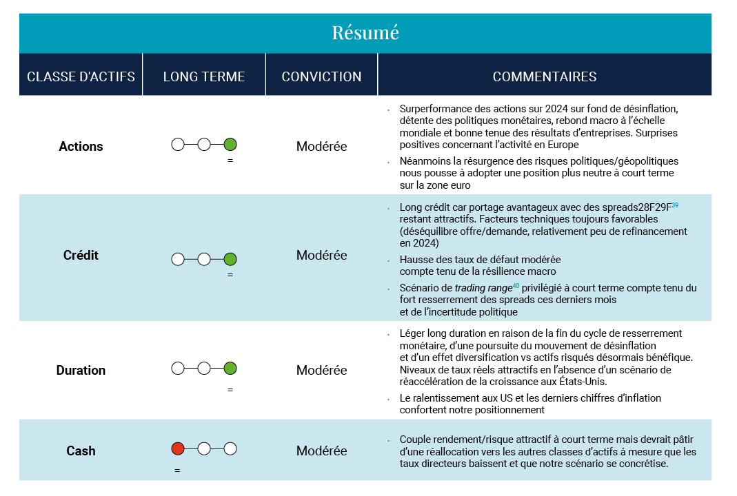 En Europe, le secteur bancaire a très bien performé, notamment les banques françaises et italiennes, du moins jusqu’à l’annonce de la dissolution de l’Assemblée nationale française. Nous étions surexposés sur ce secteur depuis la fin 2023, car il demeure sous-détenu malgré une amélioration de ses bénéfices et de ses multiples. Nous sommes neutres en ce début de deuxième semestre car le secteur financier figure en première ligne face à la résurgence du risque politique en Europe.