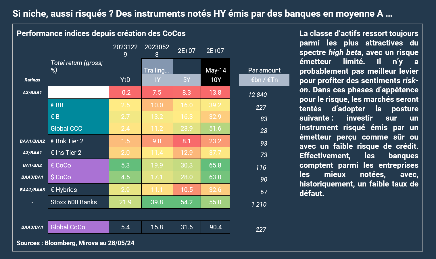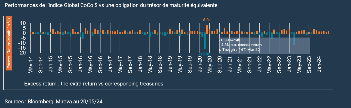 Les CoCos/AT1 font partie du peu de classes d’actifs qu’il peut coûter cher de vendre. Toutefois, Il faut s’attendre à des sauts ponctuels de performances, dont les mouvements depuis le dix juin dernier fournissent une excellente piqûre de rappel. Depuis 2013, la performance mensuelle est de 0,7%23 soit plus de 7%23 l’an jusqu’à mai 2024. Des pics à +8%23 en un mois et -16%23 ont pu advenir, surtout en 2020.