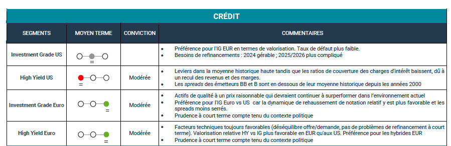 Aussi après la première baisse de taux survenue début juin, la BCE pourrait encore procéder à un abaissement en septembre. Une troisième baisse en décembre dépendra notamment des politiques budgétaires votées, en particulier française et italienne, ainsi que du résultat des élections américaines, pour un taux terminal qui devrait selon nous osciller entre 2,5 %14 et 3 %14 fin 2025.