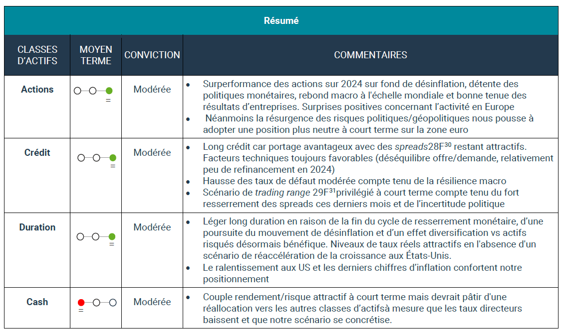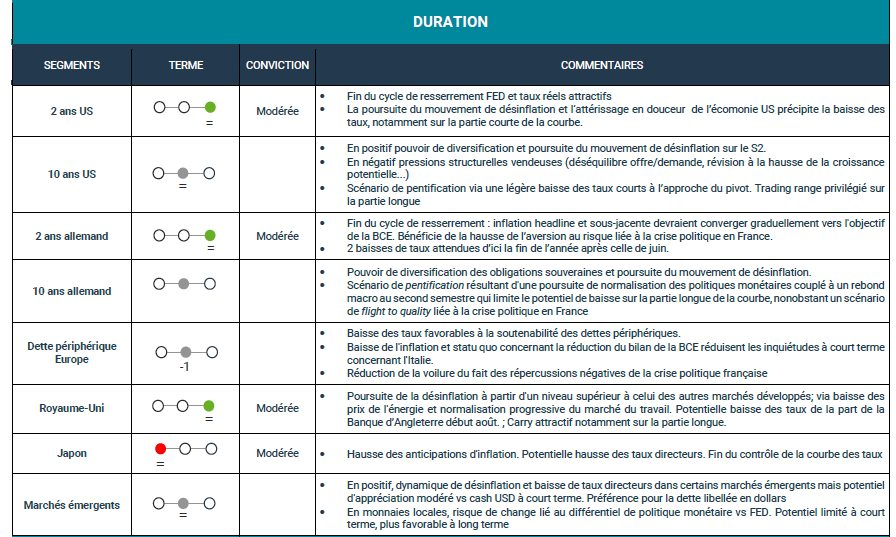La croissance pourrait donc surprendre positivement grâce au retour du moteur allemand que nous attendons depuis de longs mois même s’il s’agit avant tout d’un rebond de croissance cyclique et non structurelle. Les problèmes allemands de perte de compétitivité demeurent. Ils devront être contrebalancés par une importante réserve budgétaire, mais sans doute pas avant les prochaines élections fédérales de 2025, tant les blocages politiques demeurent forts, notamment après les récentes élections européennes (voir ci-dessous).