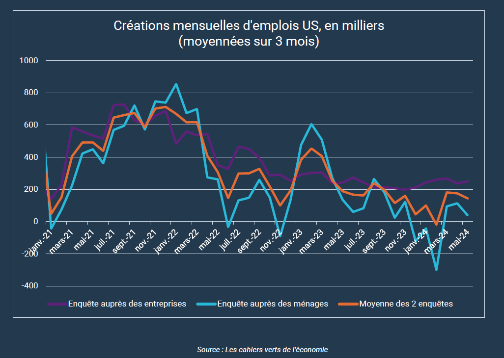 En ce qui concerne le marché du travail, il n’apparait ni trop chaud ni trop froid et semble être revenu à son équilibre d’avant Covid si l’on en croit le ratio offres d’emploi sur nombre de chomeurs désormais égal à 1,2 vs 212 début 2022, ou si l’on observe la moyenne mensuelle des créations d’emplois selon les enquêtes menées auprès des entreprises et des ménages (cf graphe du mois avec l’évolution des payroll et household survey).