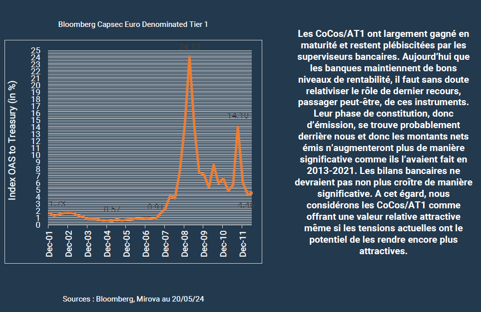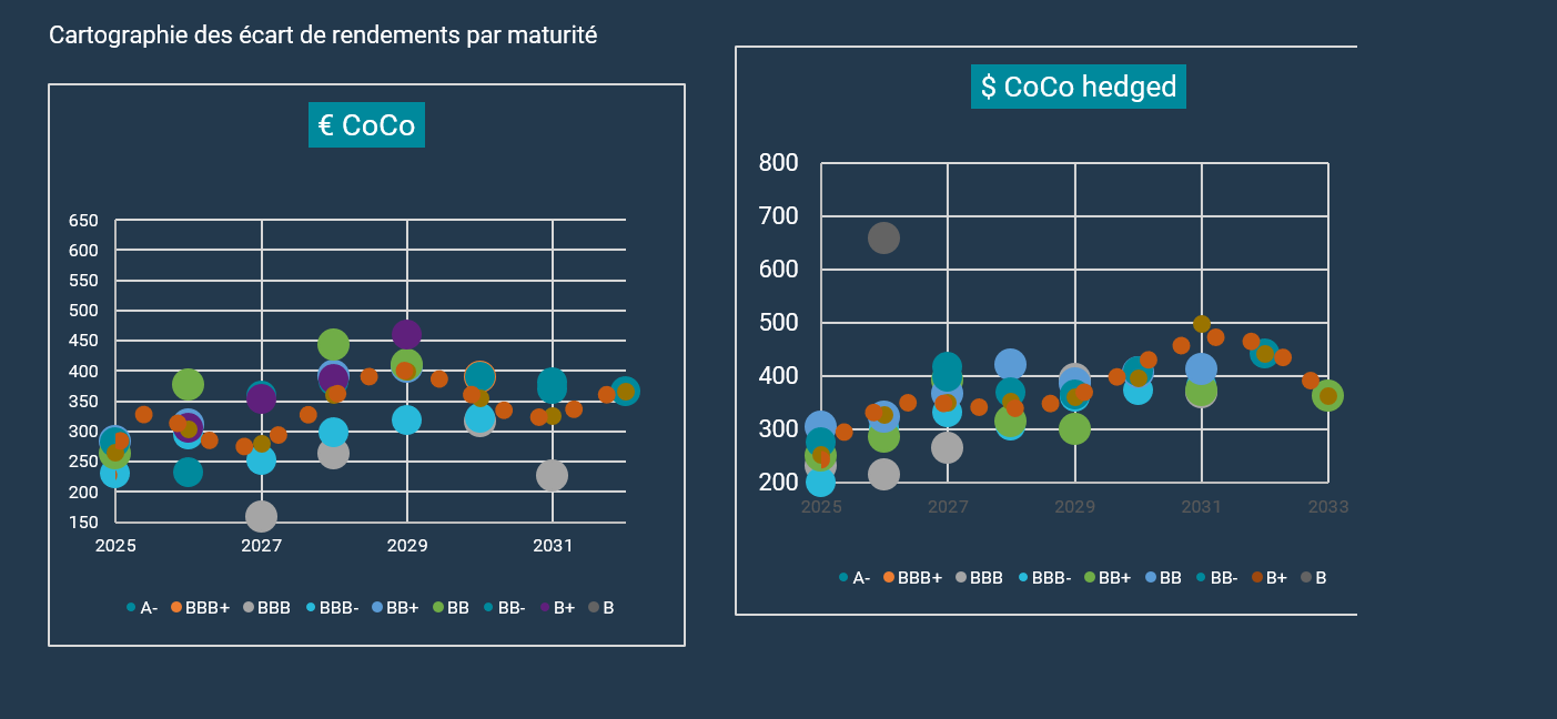 Pour ceux qui savent les valoriser et les utiliser à bon escient, elles offrent un outil assez unique de pilotage du couple rendement/ risques. Il y a une contrepartie : en périodes de risk off, il faut savoir en sortir, avant d’y revenir au moment voulu. Bonne nouvelle : leur liquidité permet de facilement exécuter tout besoin d’alléger ou de renforcer les positions sur les CoCos. Un gérant de conviction qui joue le long terme, ce qu’est Mirova, doit donc savoir y recourir, et quand y renoncer.