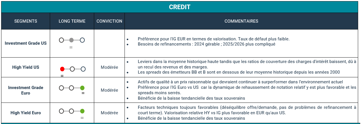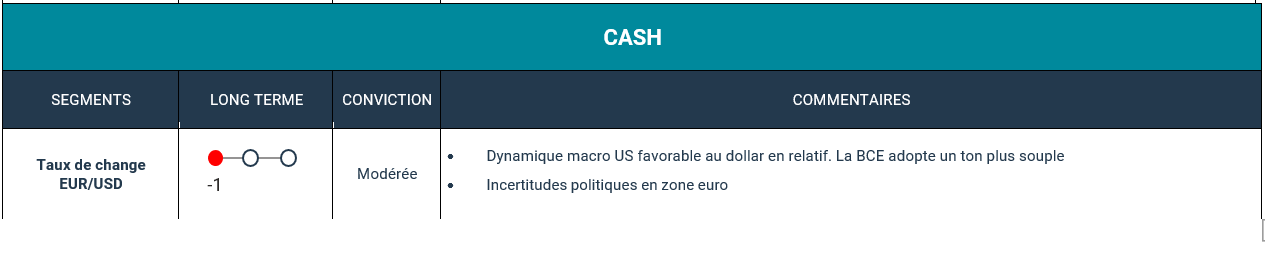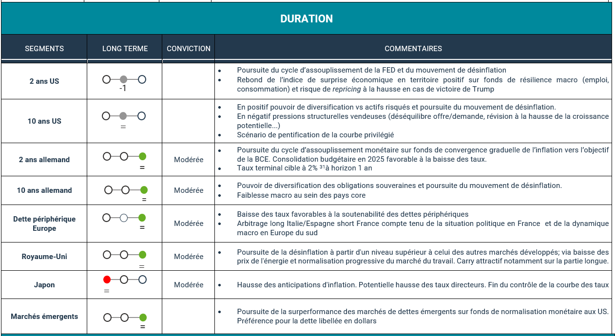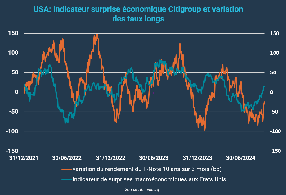 Le marché se montre également favorable au scénario politique qui semble certes le plus probable mais encore très incertain (risque de choc potentiel sur les taux post élections), avec une victoire de Kamala Harris, et une des deux Chambres remportée par les démocrates. Cela vient en effet rassurer face au spectre de mesures politiques inflationnistes et de tensions commerciales, fortement plausibles en cas de victoire de Donald Trump.