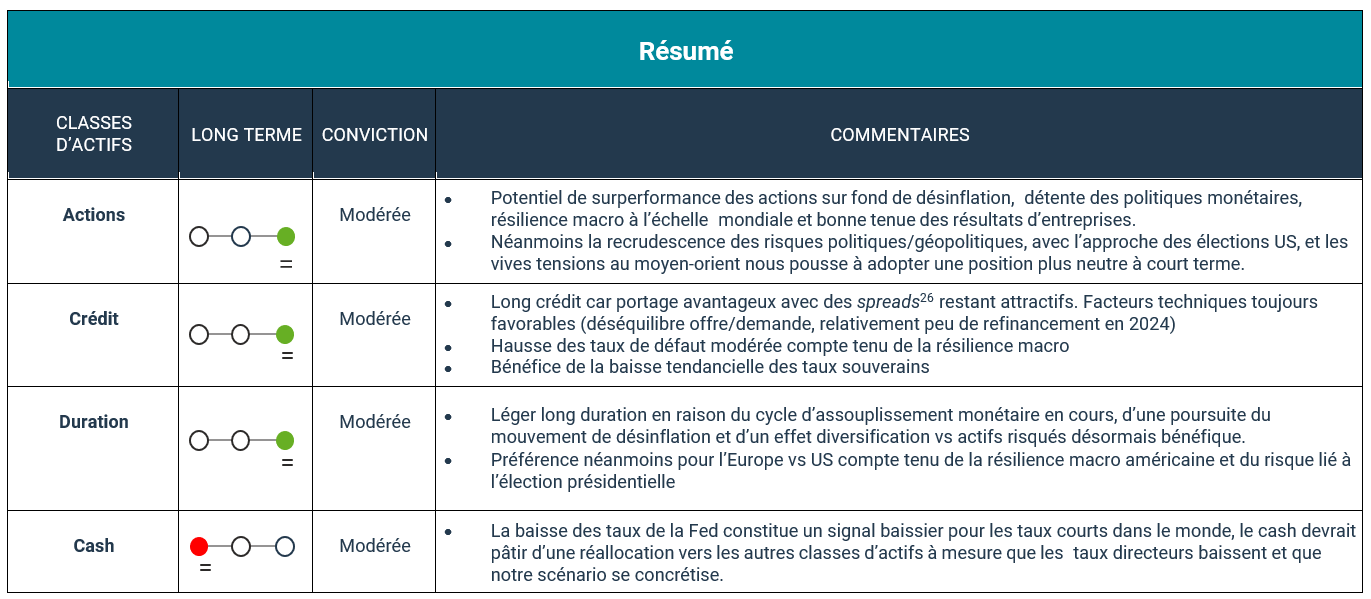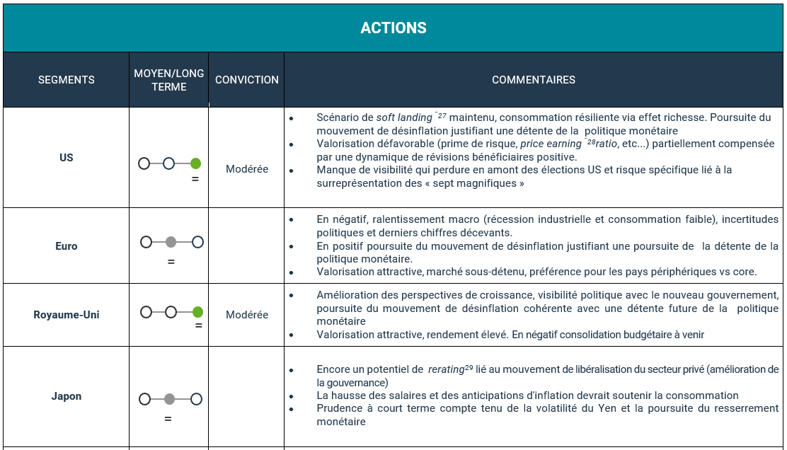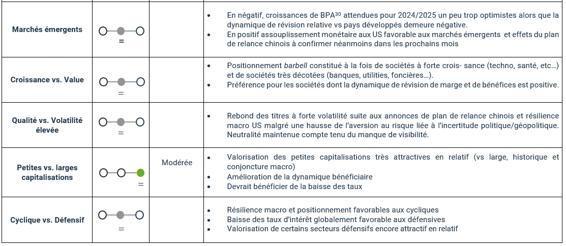 Après un très bon troisième trimestre, que va réserver la fin de l’année ? Sur les marchés, la perspective dominante reste que l’économie mondiale fonctionne globalement à son juste potentiel, en ligne avec une croissance autour des 3%, 11et ce malgré un contexte géopolitique explosif ainsi qu’une forme d’attentisme en amont des élections US. L’activité aux Etats-Unis s’avère plus résiliente qu’anticipée, avec des indices de surprise économique passés de négatifs à positifs. Notre scénario en faveur d’un soft landing américain réussi se confirme donc pour l’instant. Les points de surveillance se situent plutôt du côté de la zone euro, avec la France et l’Allemagne engluées dans des difficultés économiques et politiques, et de la Chine, où il faudra apprécier les effets des annonces de relance dans la durée.