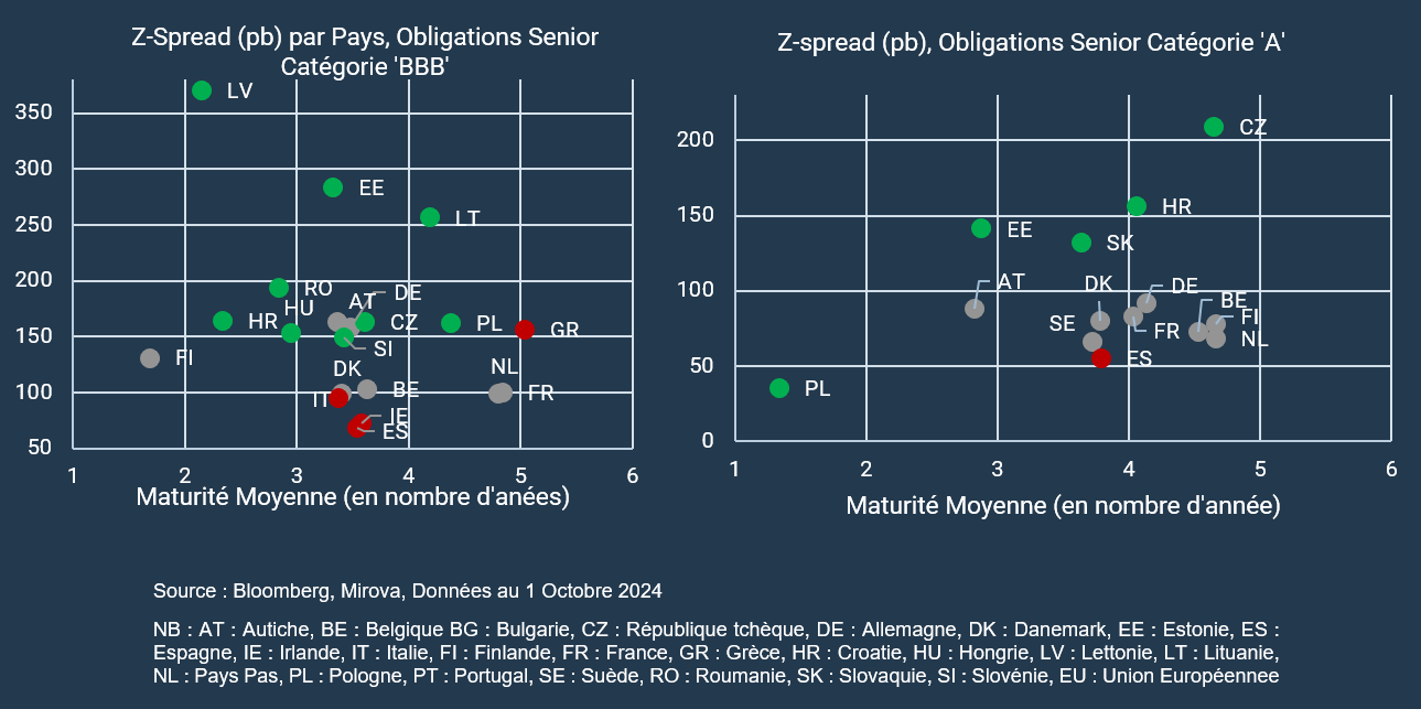 Dans la catégorie 'A', les obligations senior tchèques émises par Moneta Money Bank AS semblent particulièrement attractives, offrant un différentiel de spread d'environ 22par rapport aux obligations senior espagnoles de notation similaire. Les primes pour les obligations senior slovaques et croates paraissent également intéressantes par rapport aux pays de l'UE occidentale.