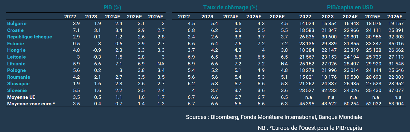 Après une période de ralentissement de la dynamique de croissance, l'activité économique dans les pays d'ECE rebondit en 2024, et cela devrait se poursuivre en 2025. Les pays d'ECE devraient connaître une croissance deux fois plus rapide que la moyenne de l'UE. L'Estonie fait figure d’exception, car le consensus prévoit que le pays reste en récession en 2024, avec une prévision de croissance du PIB de -0,6%. La République tchèque devrait croître en ligne avec la moyenne de l'UE. Nous pensons que le financement et les programmes de développement de l'UE, y compris les subventions, les prêts et les garanties, continueront à jouer un rôle crucial dans la facilitation de l'activité économique dans les pays d'ECE, contribuant aux ambitions numériques, d'énergie verte et sociales du bloc. Les banques d'ECE bénéficieront indirectement de la croissance économique résultante et directement en tant qu'intermédiaires pour les fonds de l'UE destinés aux bénéficiaires.