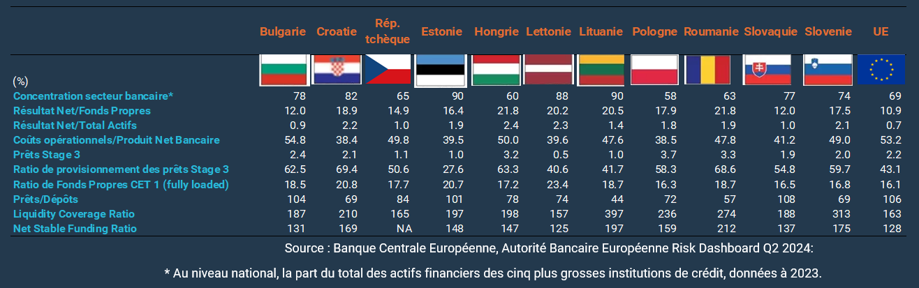 Le secteur bancaire en ECE représente une proportion relativement restreinte des actifs bancaires de l'Union européenne (UE), comptant pour environ 5 %18 du total à la fin juin 2024. La Pologne et la République tchèque en forment les plus grands contributeurs. Les banques d'ECE constituent selon nous un cas d'investissement attrayant, du fait de leur inclusion dans des économies émergentes européennes en croissance mais qui bénéficient de l'adhésion à l'UE et de son cadre institutionnel. Nous considérons que les systèmes bancaires d'ECE sont rentables, bien capitalisés, qu’ils profitent d’une qualité d'actif adéquate, globalement en ligne avec celle des banques périphériques européennes, et qu’ils disposent de dépôts domestiques stables comme source de financement. La contrepartie à ces atouts provient de risques spécifiques, parmi lesquels l'instabilité politique dans certains pays et des risques géopolitiques, notamment pour les États baltes. De plus, dans certains pays comme la Pologne et la Hongrie, l’intervention du gouvernement dans le secteur bancaire a conduit à des mesures visant à protéger les emprunteurs, ce qui a exercé une pression sur la rentabilité des banques. Néanmoins, la grande majorité des banques a absorbé ces mesures et elles y demeurent rentables.