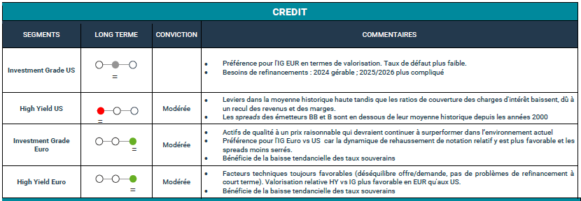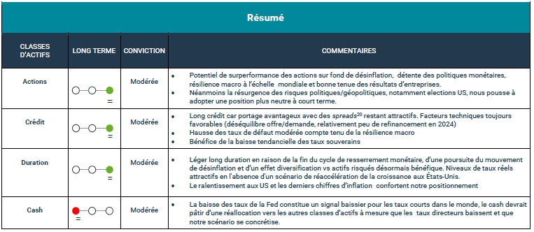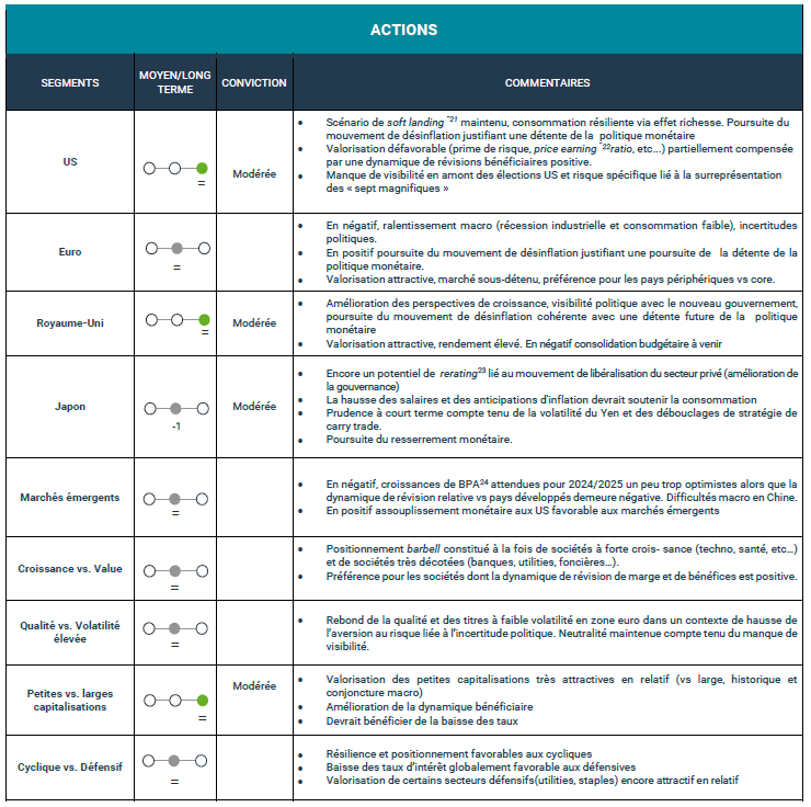 Ces derniers mois, des hypothèses de décrochage ont pu inquiéter aux Etats-Unis et en Europe ; pourtant l’économie mondiale démontre toujours une certaine résilience. L’activité dans les services compense la faiblesse de la production manufacturière. Les créations d’emplois ralentissent mais restent positives. La consommation des ménages reste correcte dans l’ensemble ; de quoi alimenter une croissance de PIB9 mondial en rythme annualisé autour de 3%10. Certes, certains signaux de faiblesse se manifestent, mais les banques centrales de part et d’autre de l’Atlantique semblent désormais prêtes à enclencher une politique plus souple, dont les effets devraient permettre de compenser en partie le durcissement attendu des politiques budgétaires en 2025 et se feront sentir bien au-delà des économies nationales.