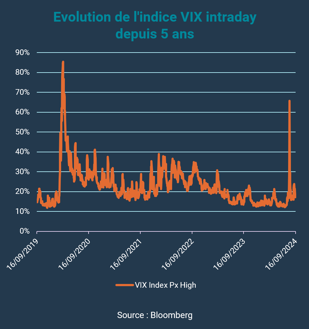 Un chiffre et tout bascule, voici ce que l’on pourrait retenir du mois d’août. La déception causée par le nombre de créations d’emplois américains au titre du mois de juillet a ravivé les craintes d’une récession outre atlantique. Des craintes qui ont été surjouées de notre point de vue, compte-tenu de l’état global de l’économie américaine. Aidé par l’absence de liquidité liée à la saisonnalité ainsi qu’un débouclage massif de stratégies de carry trade1 à la suite d’une hausse surprise des taux directeurs japonais, le VIX, indice phare de la volatilité implicite actions s’est vu propulsé vers des niveaux oubliés depuis 2008 ou 2020, en pleine crise de Covid 19. Il a en effet atteint jusqu’à 65%2 en cours de séance le 5 août. Plusieurs signaux positifs sont rapidement parvenus à enrayer ce mouvement de marché et le trou d’air de début de mois s’est finalement révélé constituer un bon point d’entrée. Le marché a ainsi repris tout le terrain perdu et fini en hausse sur le mois, de l’ordre de 2%2 pour le S&P 500 3ou le Stoxx 6004. En prenant un peu de hauteur l’amplitude de cette correction, que l’on qualifiera de technique, s’avère finalement assez conforme au comportement des bourses européennes et américaines en période estivale.