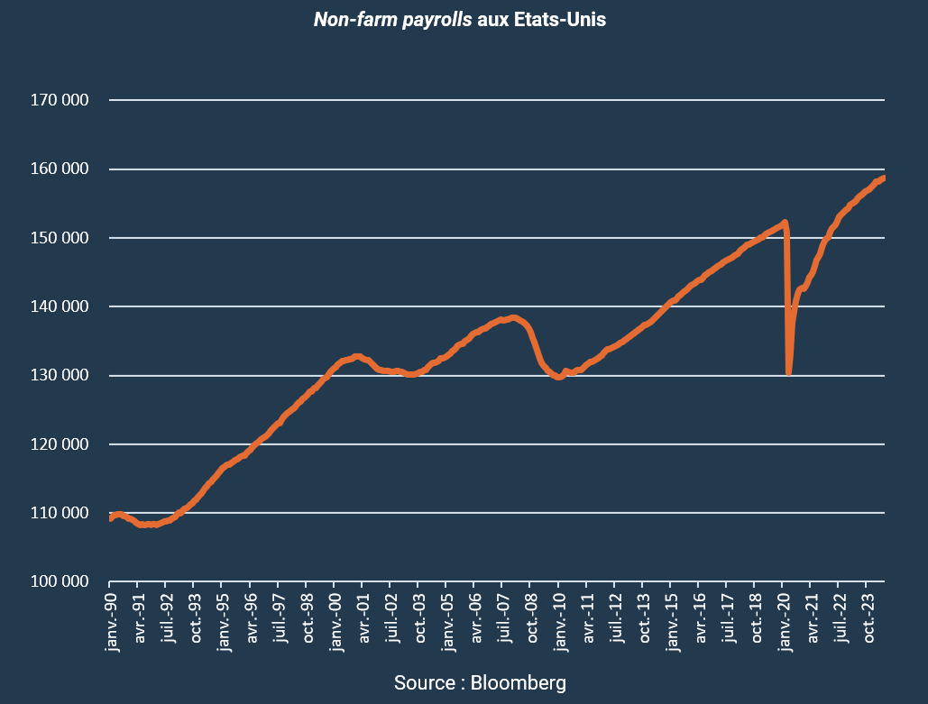 Il est vrai que le surcroît de consommation apparaît avant tout imputable à une baisse du taux d’épargne plutôt qu’à une hausse des revenus et que les réserves d’épargne semblent désormais épuisées. Mais cela ne constitue pas un point d’inquiétude à ce stade. Nous nous attendons plutôt à un léger ralentissement de la consommation au cours des prochains mois. En effet les revenus disponibles devraient rester soutenus par un marché du travail encore résilient, ainsi qu’une poursuite de la désinflation. Aussi les américains devraient pouvoir profiter de conditions financières détendues, avec un fléchissement des taux et, une bonne performance des actions. De quoi soutenir a priori la consommation.